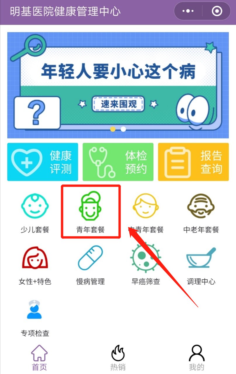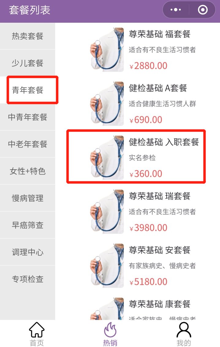2.示例:选择“青年套餐”查看可预约的入职体检套餐
