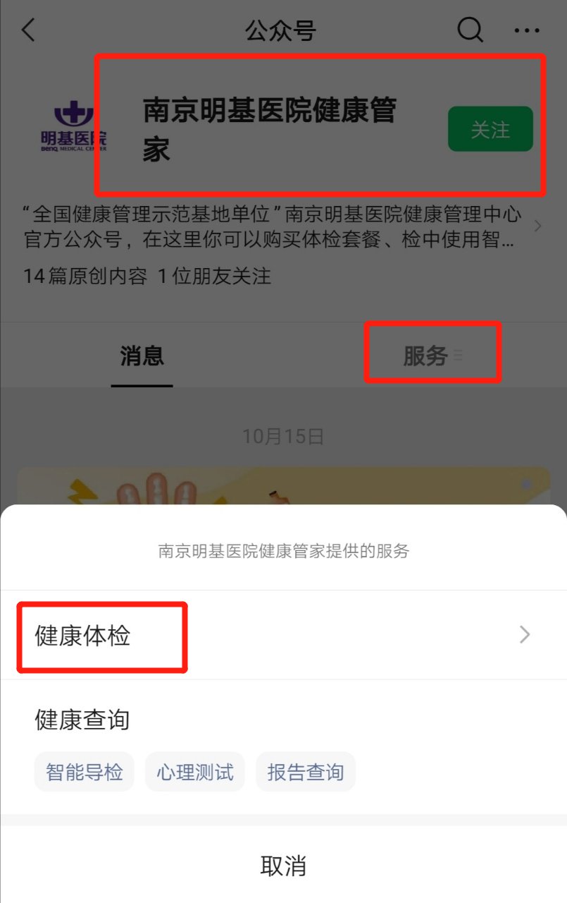 1.搜索“南京明基医院健康管家”微信公众号,点击菜单栏“服务”-健康体检