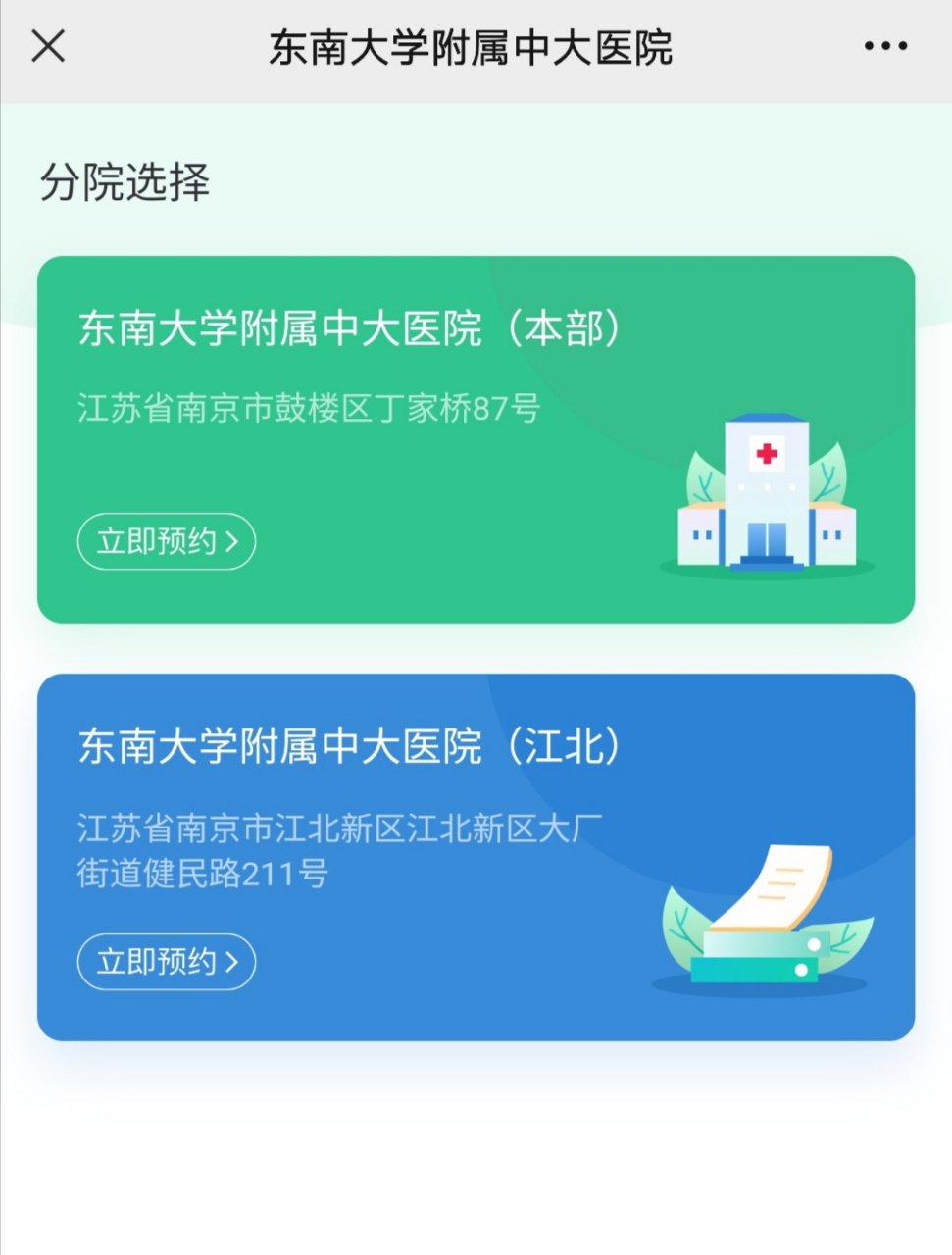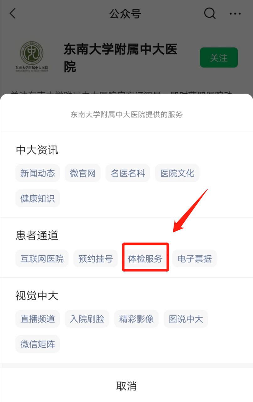 1.微信搜索“东南大学附属中大医院”-点击“服务”