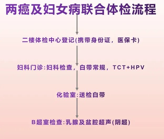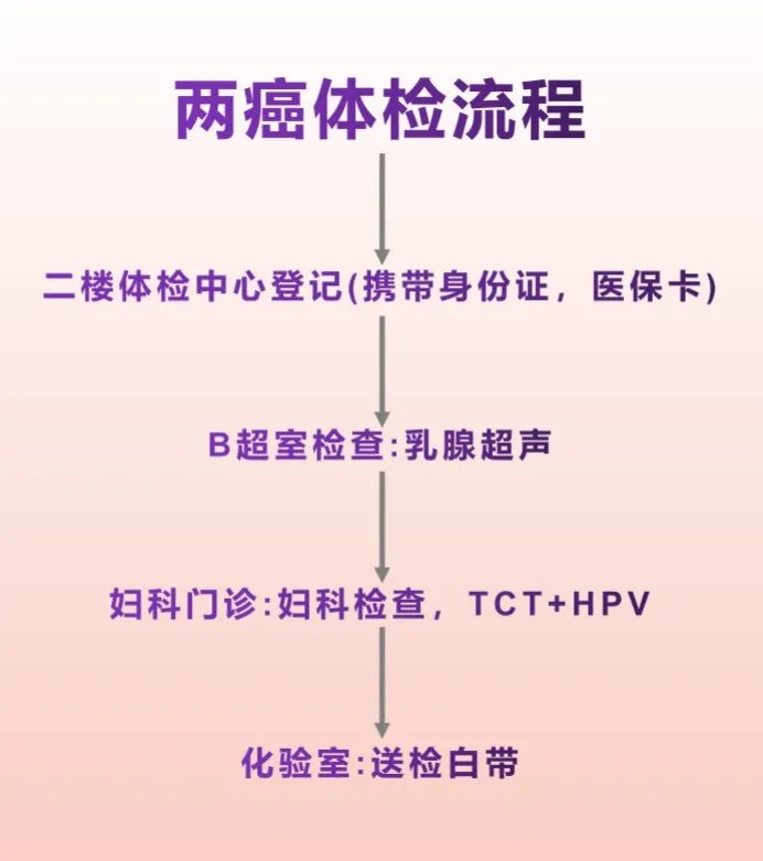 没有做过子宫或者乳腺切除手术的妇女请在预约好的时间携带医保卡或身份证(每周一至周四)下午14:00-16:00前往二楼体检中心咨询台登记参加免费两癌筛查。