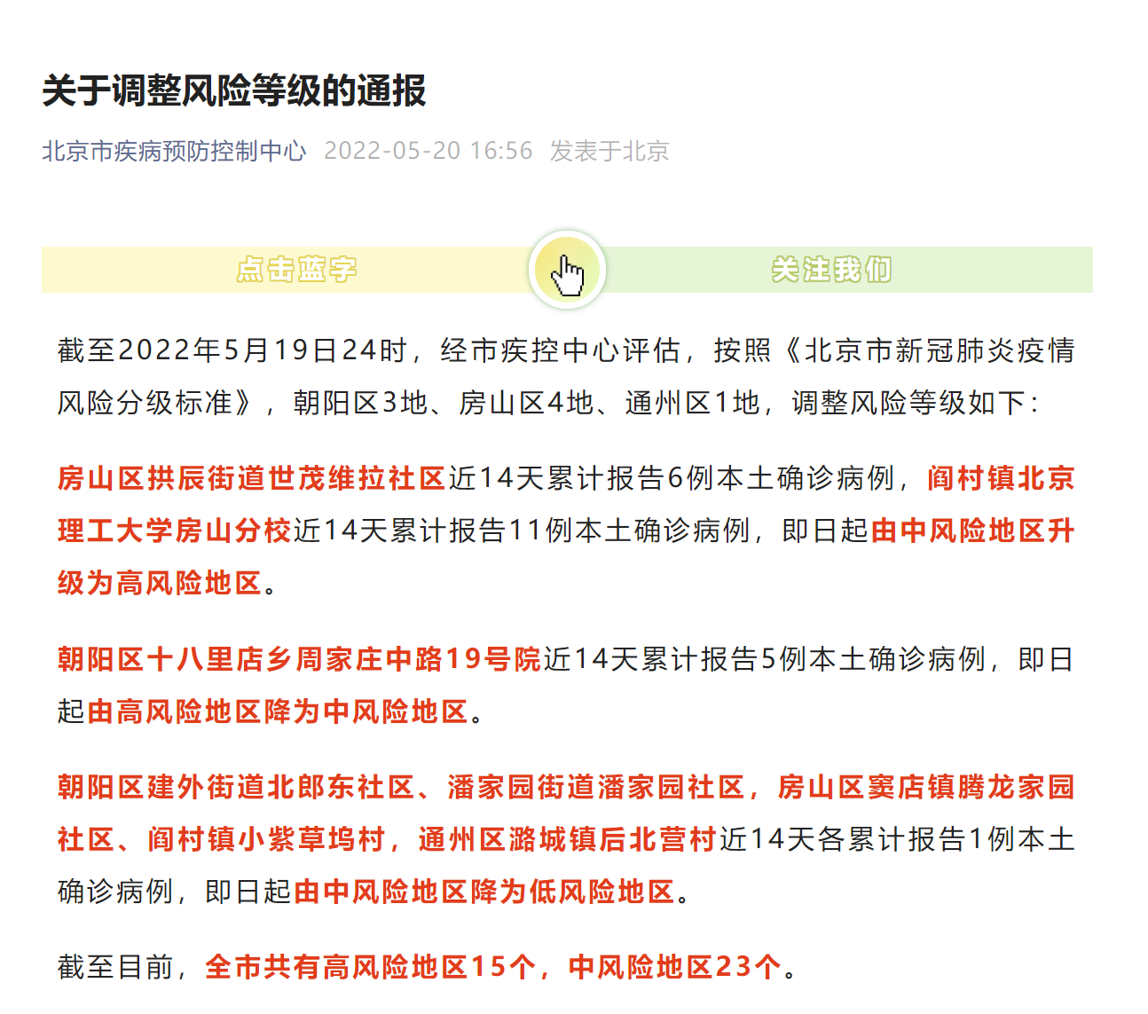 截至5月20日18时,北京市共有高风险地区15个,中风险地区23个。