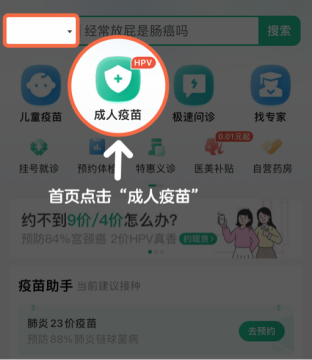 (2)下载后,选择地区,点击“成人疫苗”,点击“抢苗助手”