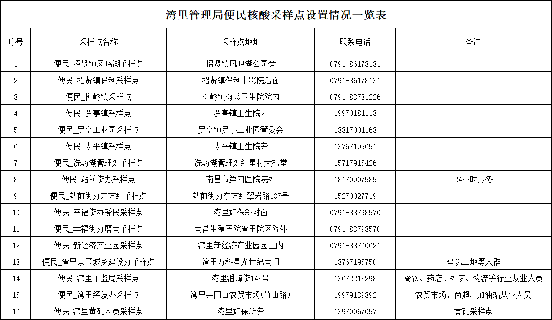 ➤南昌市湾里管理局常态化核酸检测采样点名单: