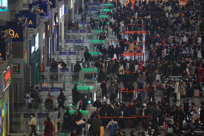 ↑2月9日,上海虹桥火车站,旅客排队等待检票进站 图据视觉中国