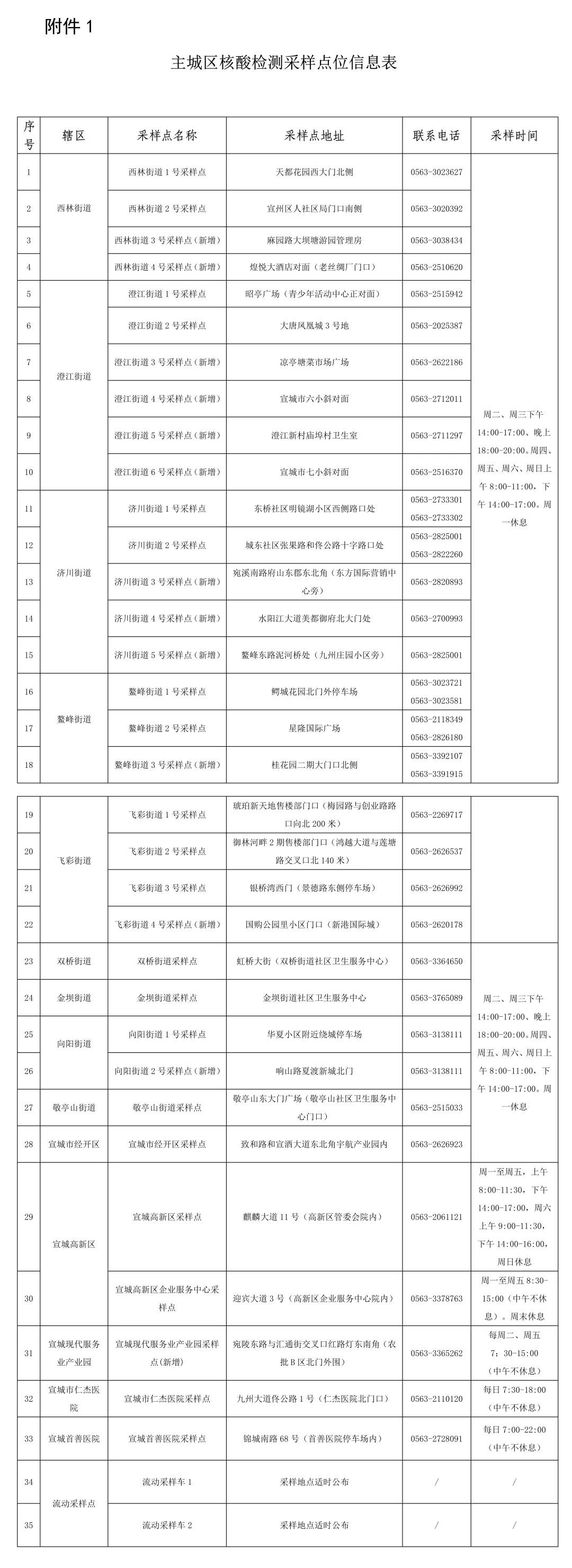 自5月28日起,主城区各街道核酸采样点开放时间调整为周二、周三下午14:00-17:00、晚上18:00-20:00,周四、周五、周六、周日上午8:00-11:00、下午14:00-17:00。周一工作人员休整,暂停采样。相关园区、医院等采样点的采样时间见附件。