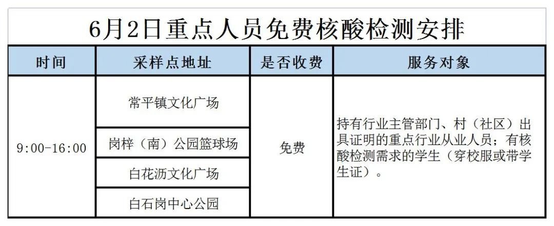 为充分发挥核酸检测的“排雷兵”作用和监测预警作用,常平镇继续开展重点人员核酸抽检工作。6月2日安排如下: