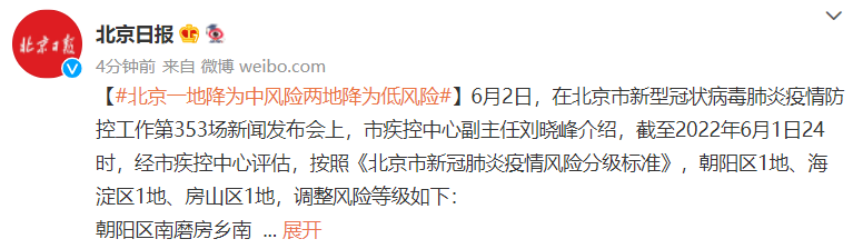 具体信息:截至2022年6月1日24时,经市疾控中心评估,按照《北京市新冠肺炎疫情风险分级标准》,朝阳区1地、海淀区1地、房山区1地,调整风险等级如下: