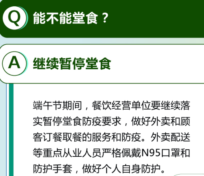 餐饮经营单位要继续落实暂停堂食防疫要求,做好外卖和顾客订餐取餐的服务和防疫。