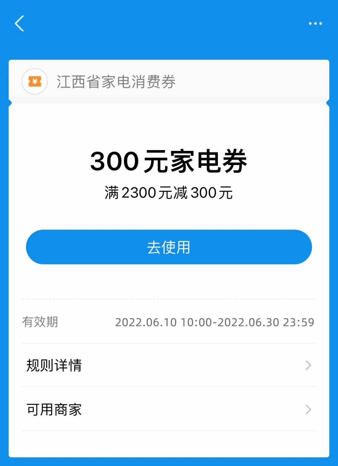 2022年6月10日上午10:00;6月10日上午9:30支付宝首页开始显示“江西省家电消费券”领取氛围图,当天上午10:00开始领券。