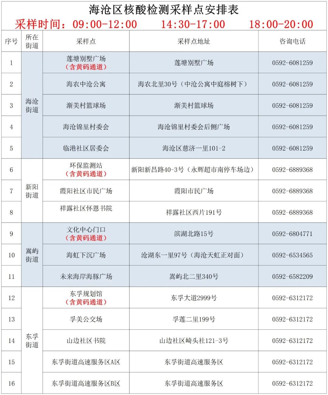 11 | 集美街道 | 集美税务局采样点 | 集源路137号 | 9:00--11:30 14:30--20:00(17:30--18:30暂停,进行消杀、转运) | 6687525 |