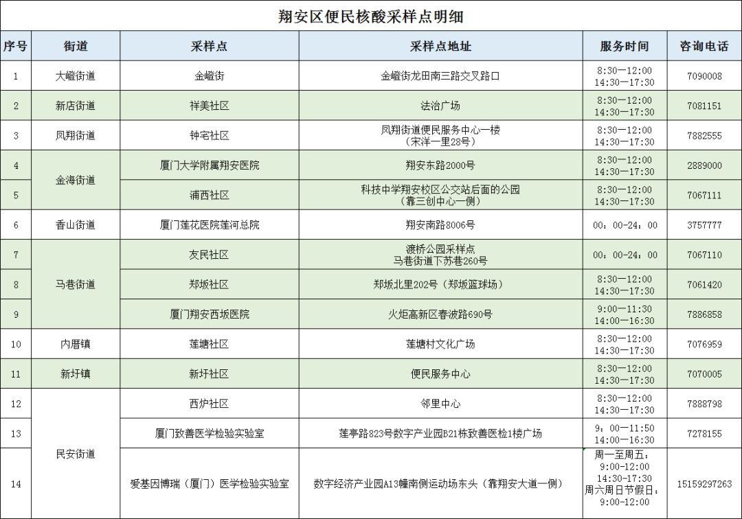 13 | 杏林社区采样点 | 苑亭路320-3大食堂快餐店边上 | 9:00--11:30 14:30--20:00(17:30--18:30暂停,进行消杀、转运) | 6288608 | |