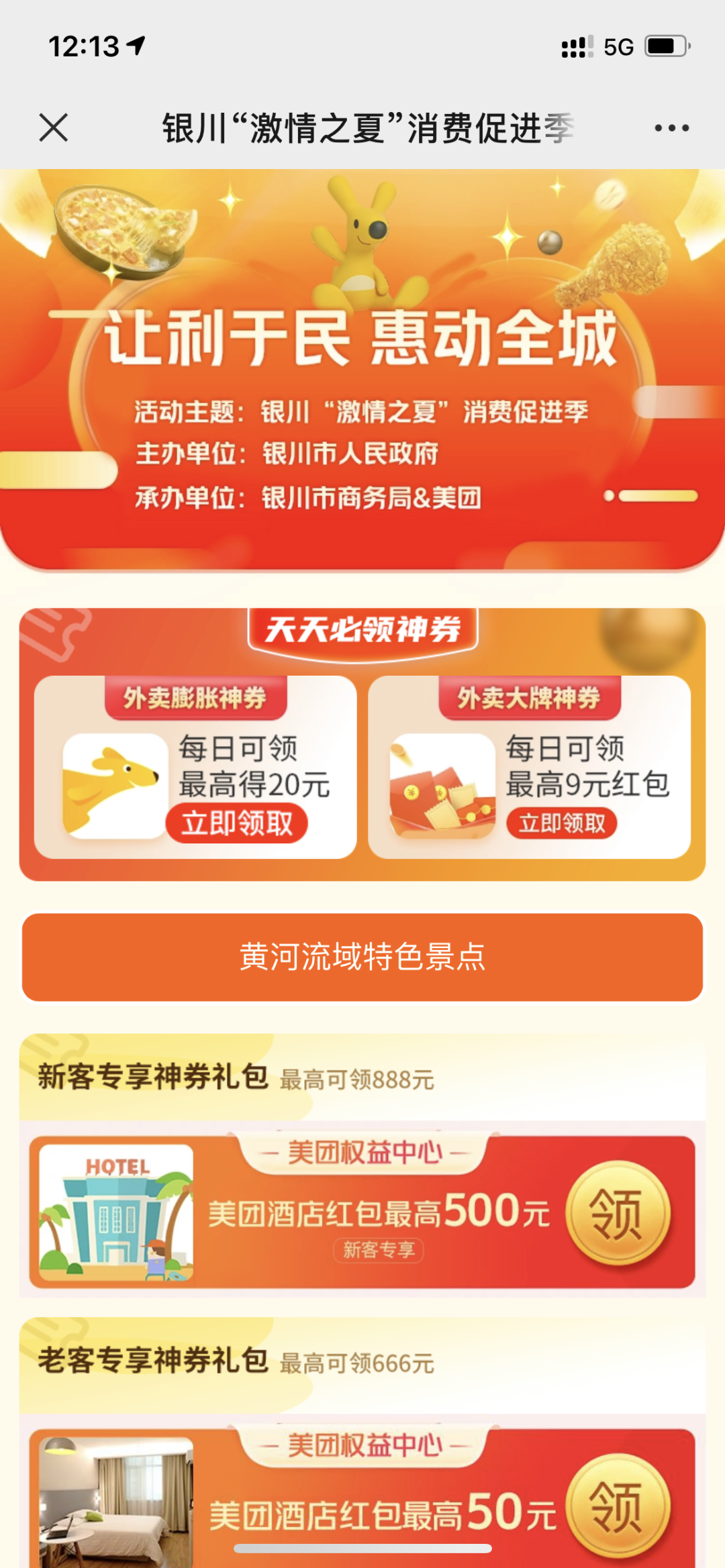 活动期间,按照“政府搭台,平台参与”的形式,美团充分整合线上优质资源,定制“激情之夏”专属会场,消费者通过扫描活动二维码进入主题页面可每天领取促消费红包,同时在弹窗页面中可随机领取5-20元消费补贴。除此之外,围绕银川黄河流域特色景点、餐饮、休闲娱乐、门票等可一键触达,多措并举打造优质惠民体验,推出满减特惠活动,为消费者带来吃喝玩乐购全方位优惠福利。
