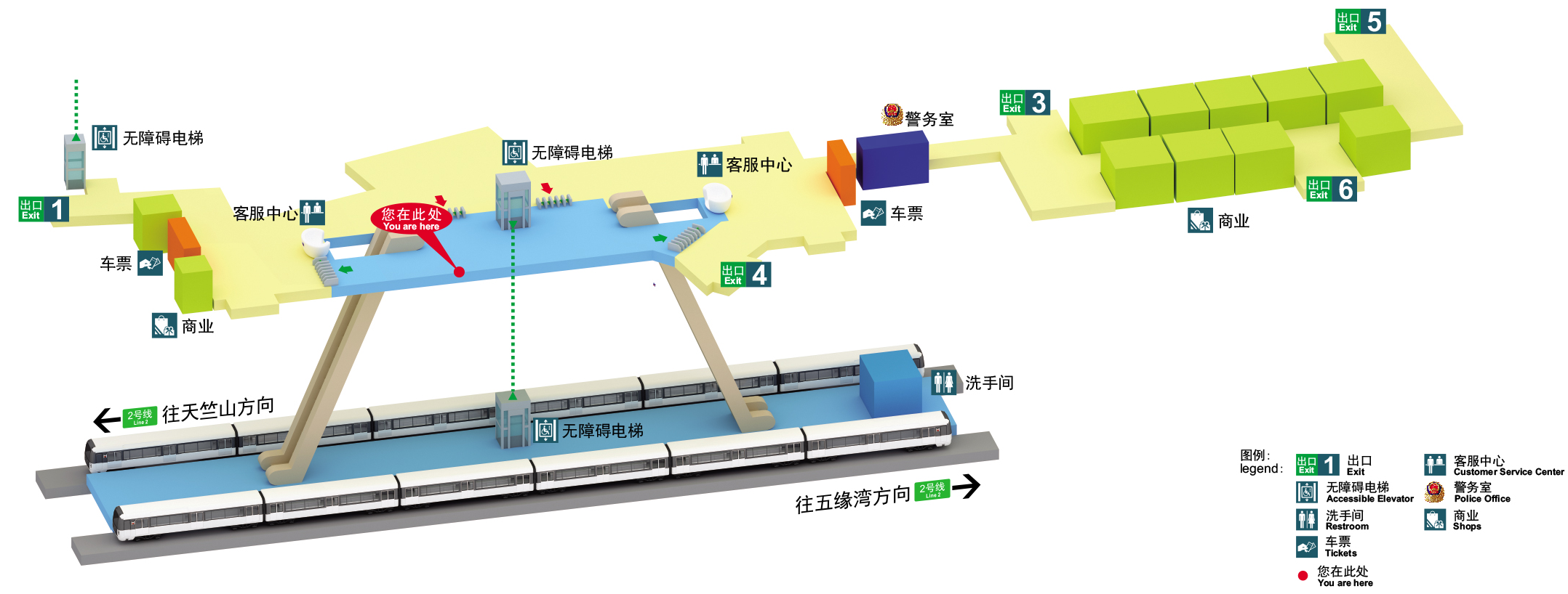 无障碍电梯:站内2号线-1、-2中部,3号线-1、-3层中部;出入口9处、1处