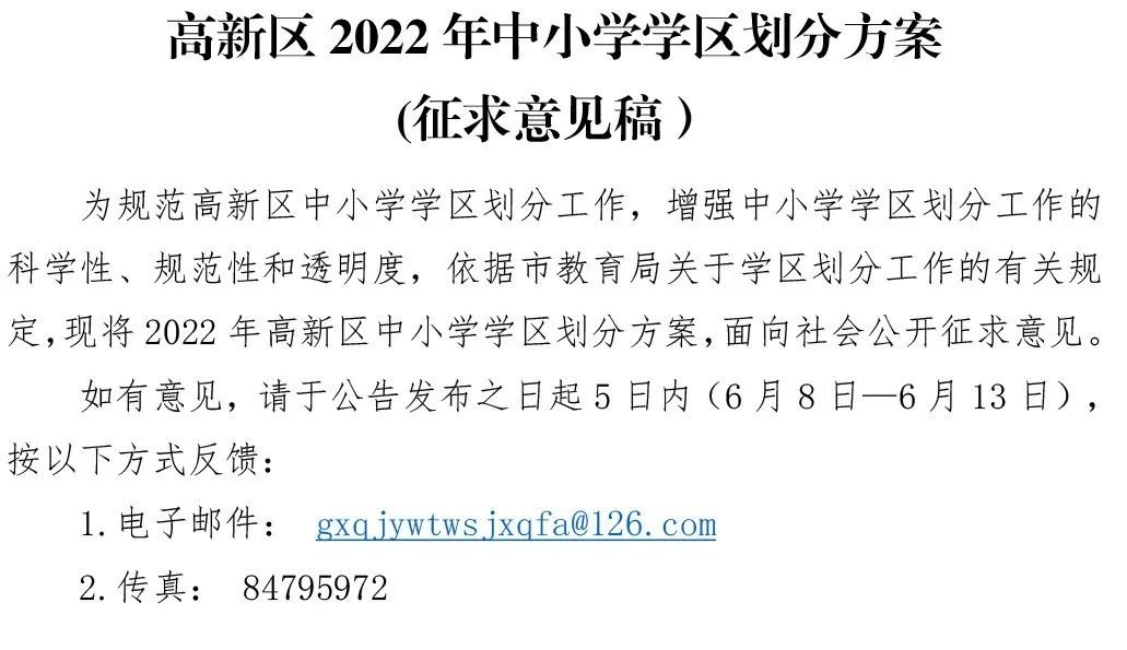 为规范高新区中小学学区划分工作,增强中小学学区划分工作的科学性、规范性和透明度,依据市教育局关于学区划分工作的有关规定,现将2022年高新区中小学学区划分方案,面向社会公开征求意见。