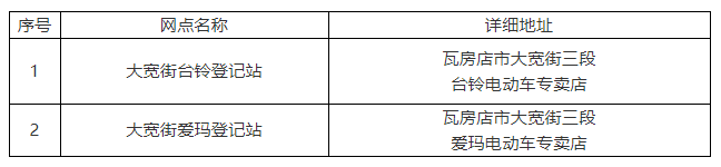 为推进瓦房店市电动自行车登记备案工作,方便市民就近办理电动自行车登记备案,自2022年6月13日起瓦房店市公安交通管理部门先期设置2个登记备案网点进行电动自行车的登记备案,后期将根据车主实际办理业务需求,适时增加布设登记网点,详细地址如下: