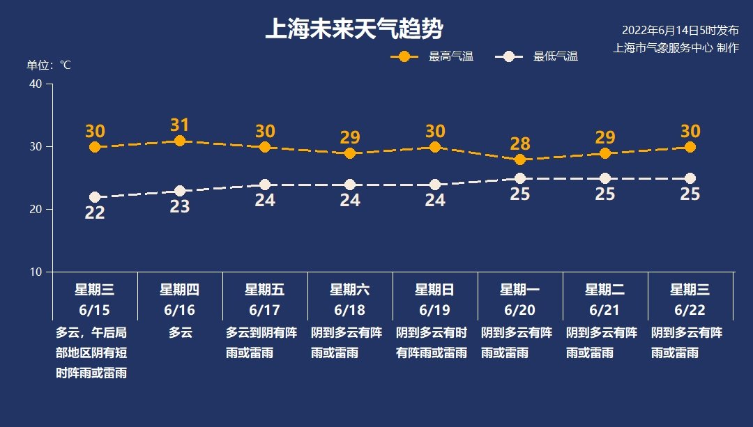 天气趋势:5~17日,上海位于雨带的北缘,以多云天气为主,多午后雷阵雨天气。最高气温进一步回升至30℃附近。18~21日,随着主雨带北抬至长江下游地区,上海多阴雨天气,并伴有雷电活动。气温平稳,在24~30℃之间。