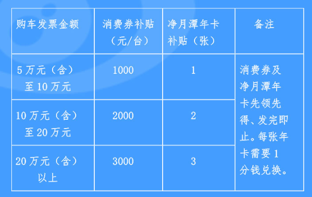 按购车发票金额(单车销售价格需为购车发票含税金额)补贴分为三档,每档补贴不同金额消费券,同时每档额外补贴不同数量净月潭年卡,消费券可在名单内的限上商场、超市、汽车零售、旅游企业购买百货、旅游、汽车内饰、汽车保养等产品使用,具体标准如下。