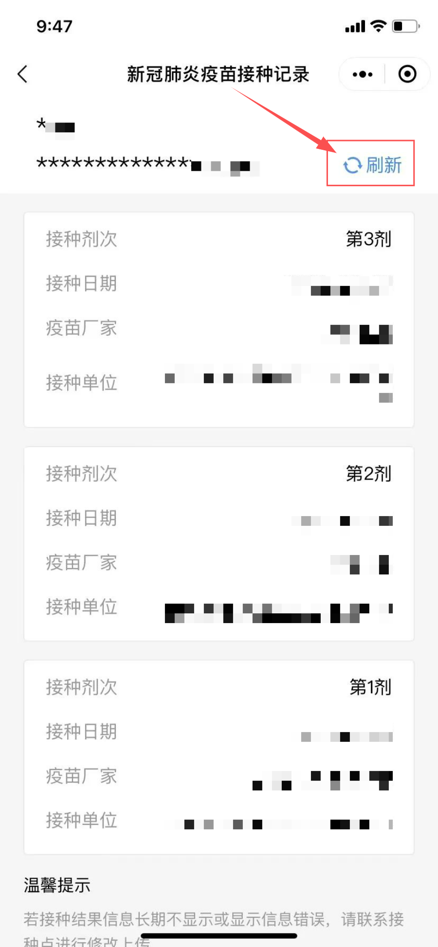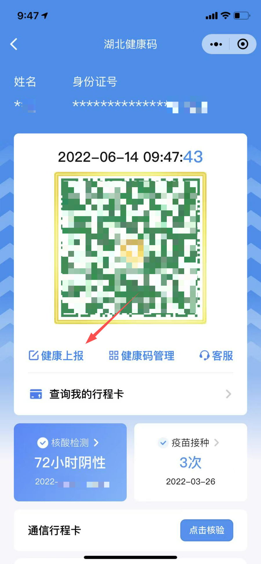 如接种了新冠疫苗长期不显示,可先尝试点击健康码下方-进行健康上报 ,并点击疫苗查询页面的蓝色双箭头刷新。