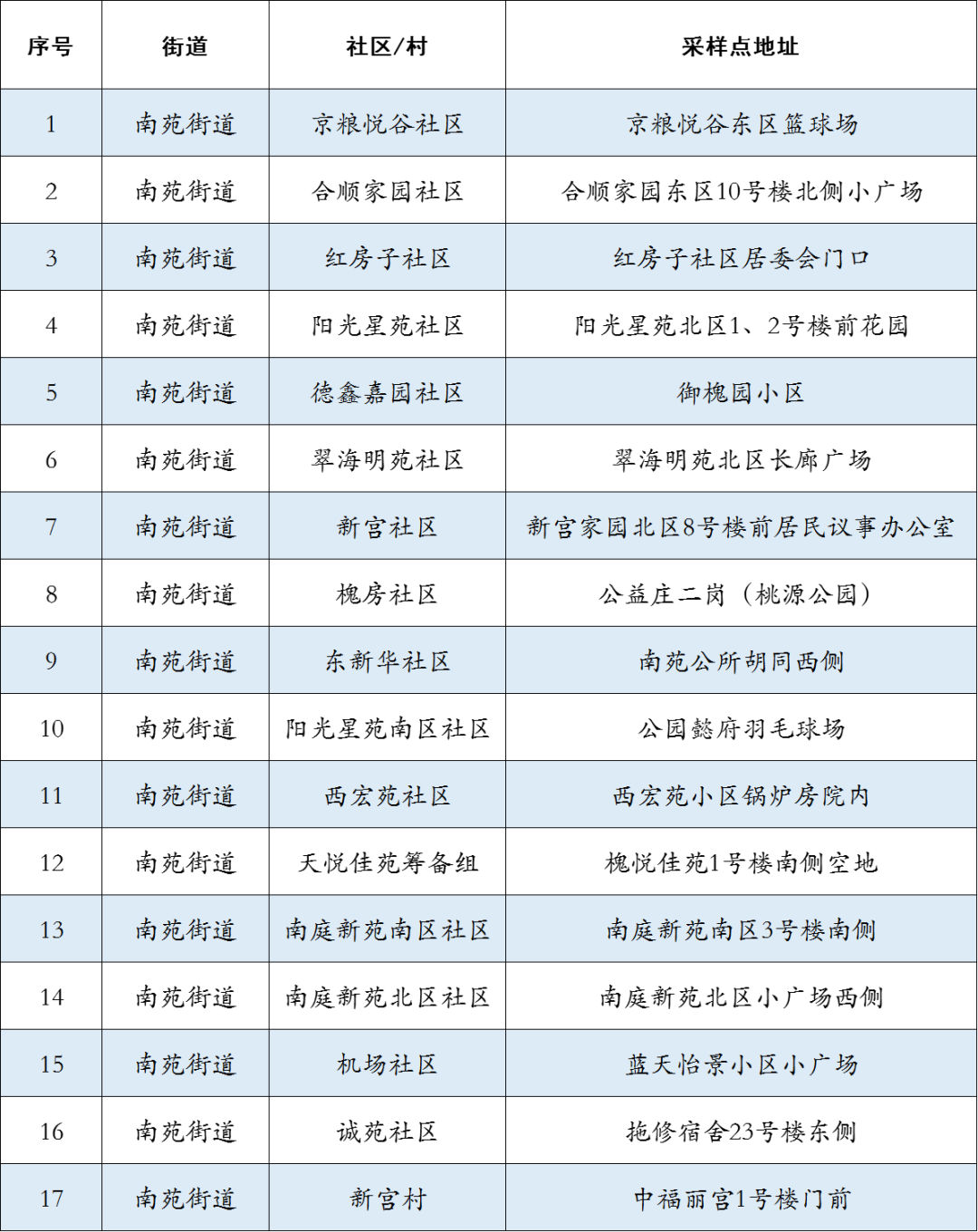针对近期聚集性疫情面临的社区传播风险,6月17日,南苑街道在常态化核酸采样点位的基础上同步设立以下临时采样点位。广大居民朋友可根据自身需求,按照所在社区、村通知就近选择点位参加核酸检测。