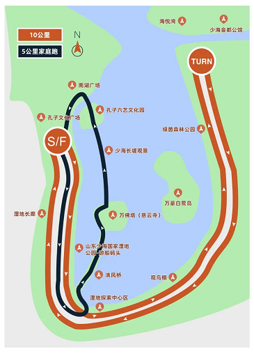 少海湿地公园孔子文化广场(起点)->少海南路->日县广场->清风桥->万佛塔->二十四孝桥->明月桥->孔子六艺文化园->少海南路->少海温地公园孔子文化广场(终点)