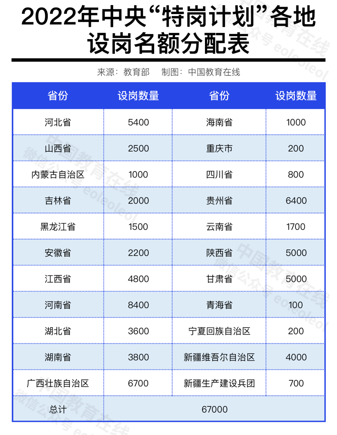(二)招聘数量。2022年计划招聘中央“特岗计划”教师67000名,相关省(区、市)和新疆生产建设兵团的招聘计划名额见《2022年中央“特岗计划”各地设岗名额分配表》(附件)。