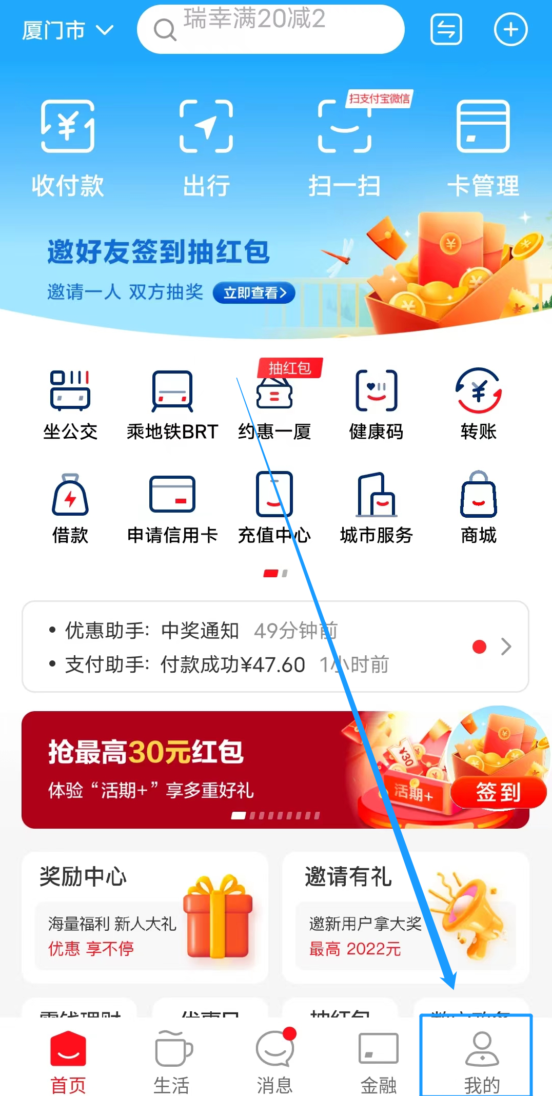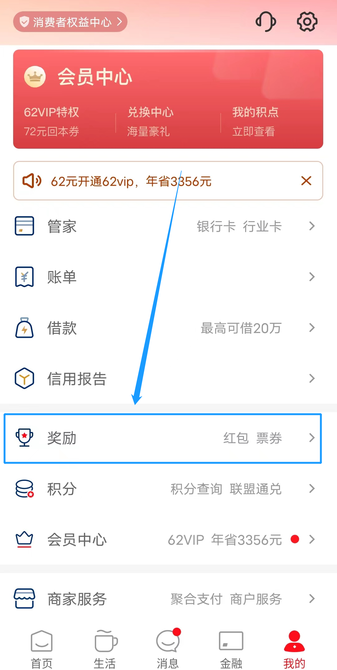 在云闪付APP首页找到“奖励中心”,进入“奖励中心”领取消费券