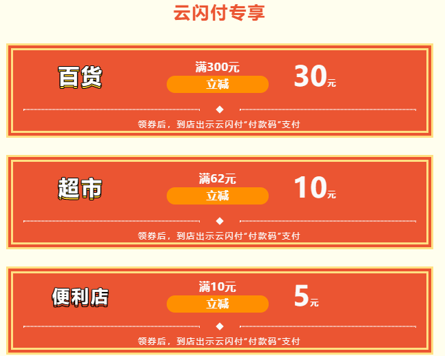 已获“满300元立减30元百货消费券”“满62元立减10元超市消费券”“满10元立减5元便利店消费券”的云闪付用户,到店时出示已获票券,告知收银员使用云闪付APP,出示云闪付APP生成的“付款码”,完成票券的实际核销。