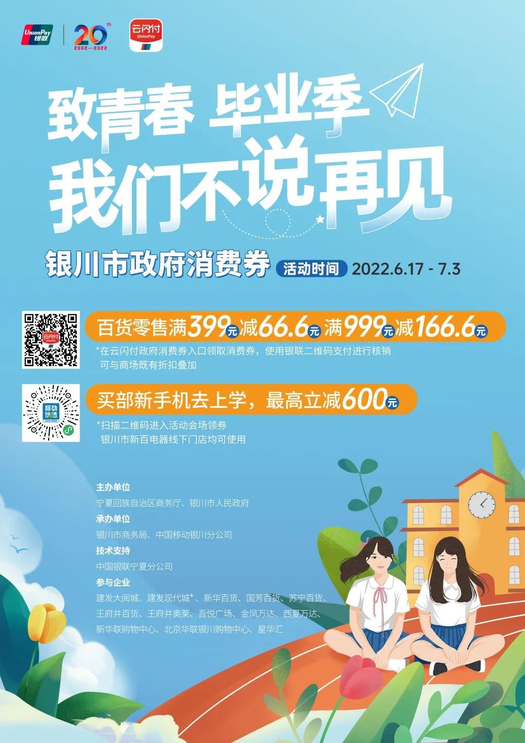 参与商户:银川市辖内新华百货、王府井百货、王府井奥莱、国芳百货、建发大阅城、建发现代城、苏宁百货、吾悦广场、金凤万达、西夏万达、新华联购物中心、北京华联银川购物中心、上陵星华汇等报名参加的商圈零售企业。