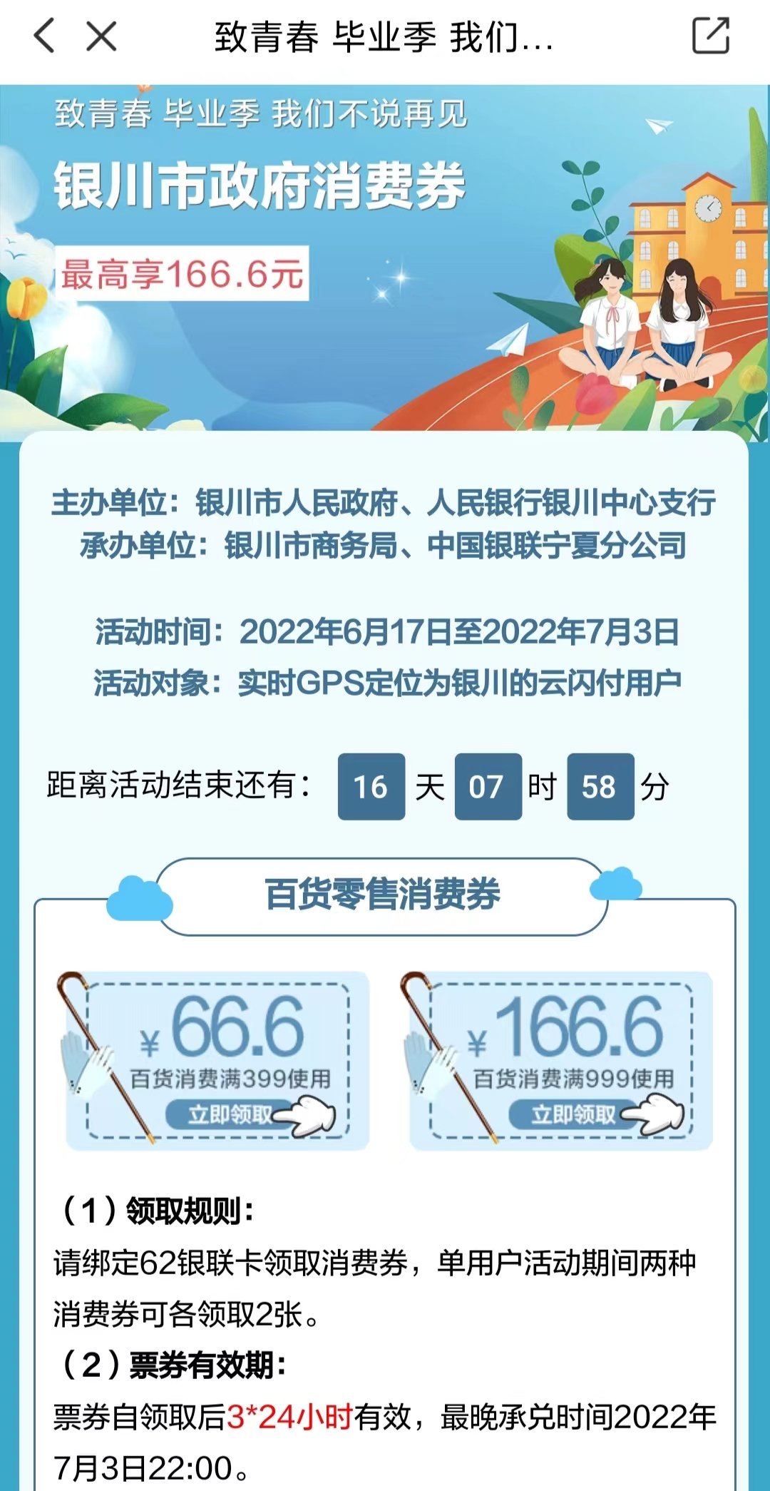 进入银联云闪付APP首页,点击“惠民消费券”专区进入活动入口,即可领取相应政府消费券。注:本次消费券仅限GPS为银川的用户领取。