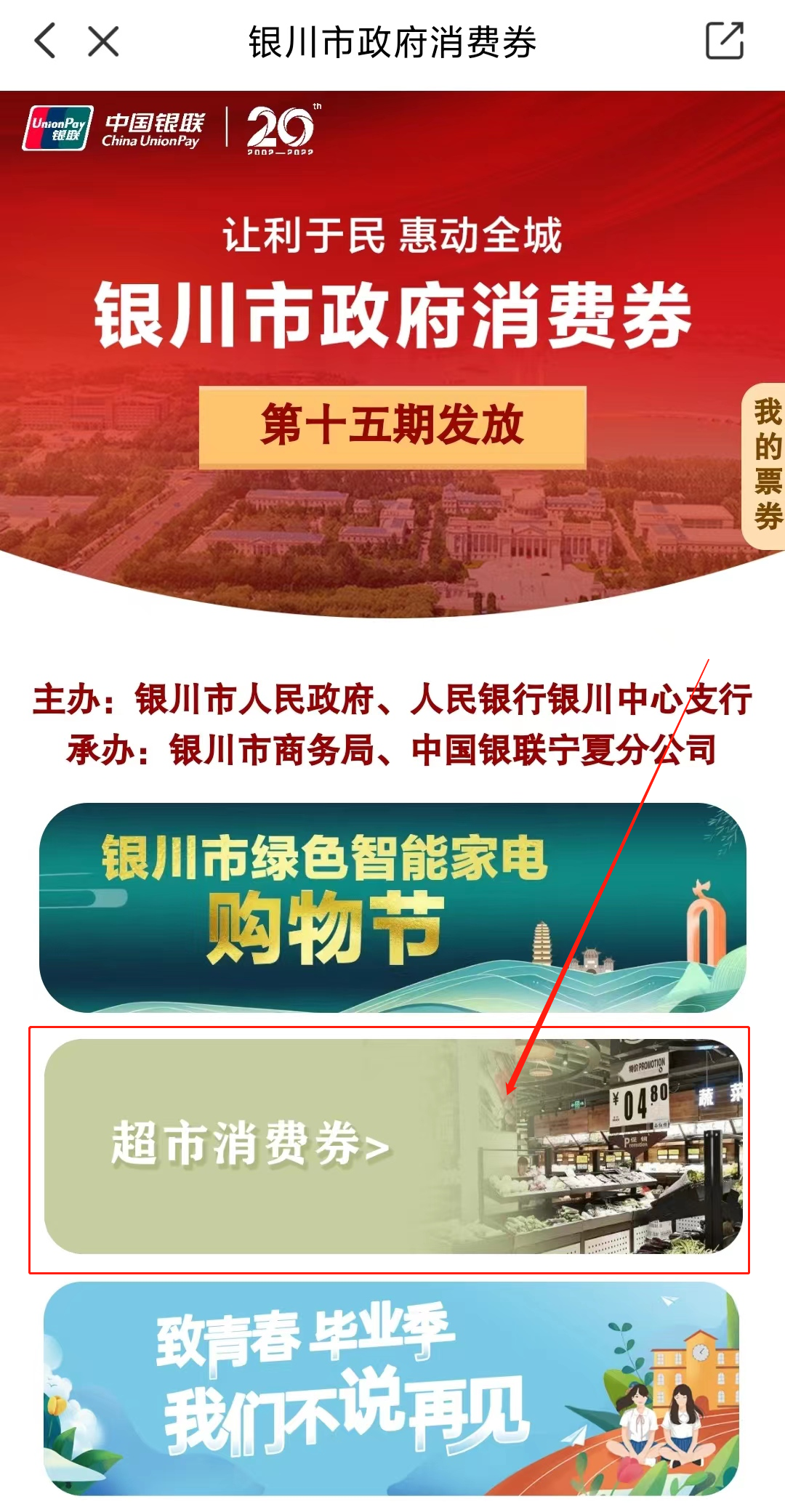 参与商户:银川市辖内新百连超、小任果蔬、永辉超市、北京华联、大润发超市、天天鲜便利店等报名参加的商超企业。