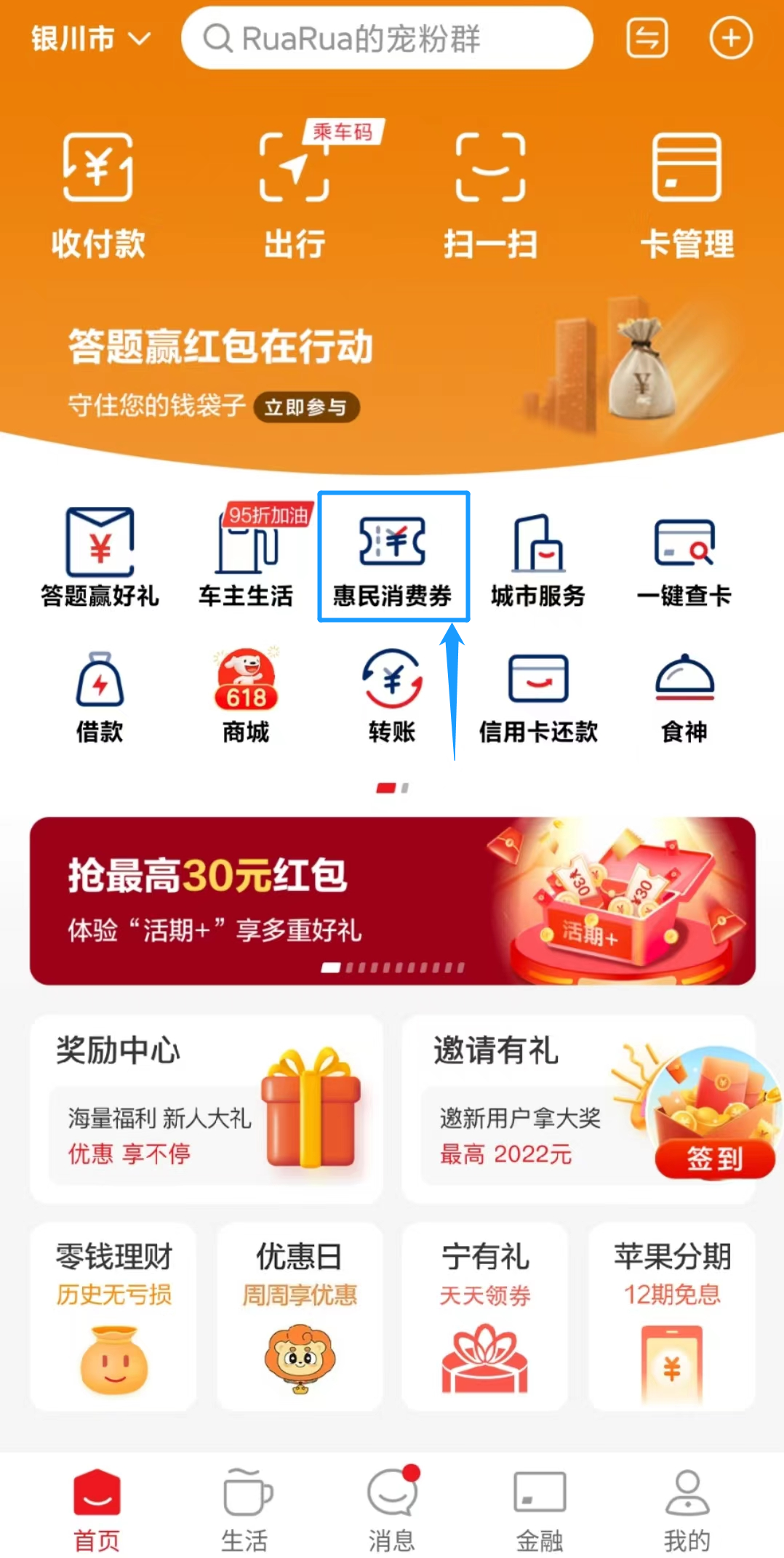 进入银联云闪付APP首页,点击“惠民消费券”专区进入活动入口,即可领取相应政府消费券。注:本次消费券仅限GPS为银川的用户领取。