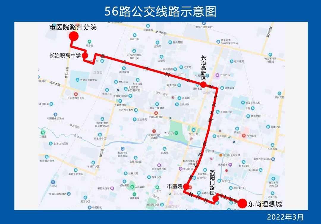 为进一步优化线网布局,填补公交盲区,长治公交集团定于2022年3月18日开通56路公交线,具体情况如下: