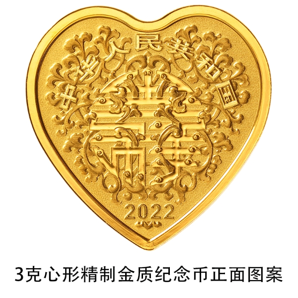 3克心形金质纪念币为精制币,含纯金3克,外接正方形边长18毫米,面额50元,成色99.9%,最大发行量20000枚。