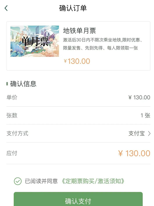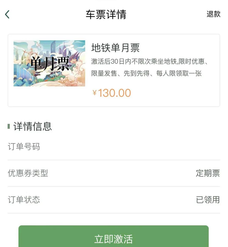 (二)购买“地铁单月票”后,可在30个自然日内激活使用。在激活使用前,乘客可自行在线申请退票。若超过30个自然日仍未激活,系统将自动发起退票,涉及退款资金将由原渠道全额退还至乘客付款账户。“地铁单月票”一经激活即不可退款。
