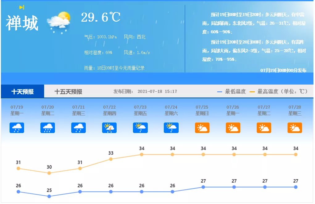 [禅城区]:佛山气象台预计,19日至21日佛山多雷雨,局部雨势强。禅城区预计未来一周天气雨水较多,请注意做好防御并留意最新的预报预警消息。