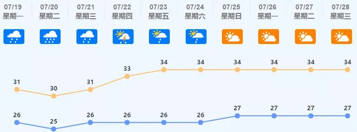 7月19日:多云间阴天,有中雷雨,局部暴雨,气温26℃-31℃;