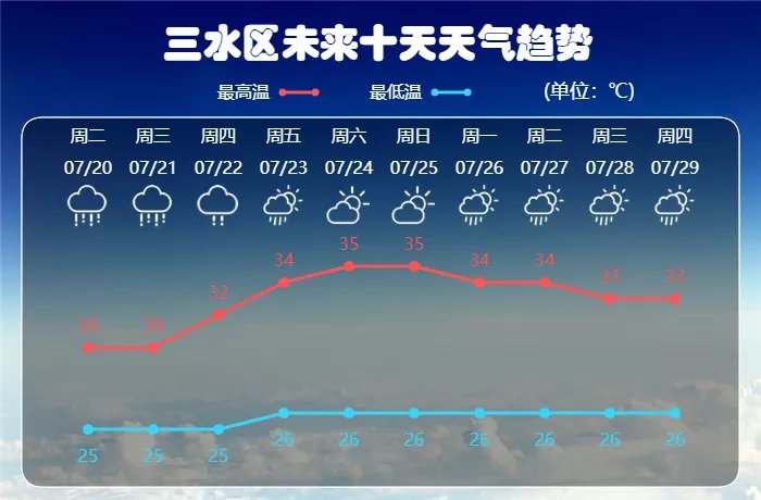 ▣ 7月25日:多云,局部有阵雨,气温28~35℃;