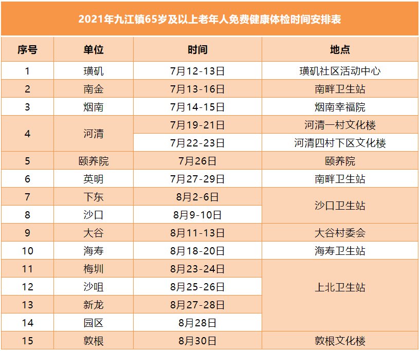 目前,由九江镇卫健办联合镇社卫中心、南海区第九人民医院、广东省中西医结合医院沙头分院和各村(居)举办的老年人免费健康体检服务正有序推进中,2021年1-6月,共有5289名老年人参加体检,事不宜迟,还未参加体检的赶紧看看下半年体检安排: