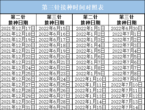 对照接种时间,比如2021年12月18日前(含12月18日)完成第二针接种的人群,2022年6月16日就可以接种第三针了。