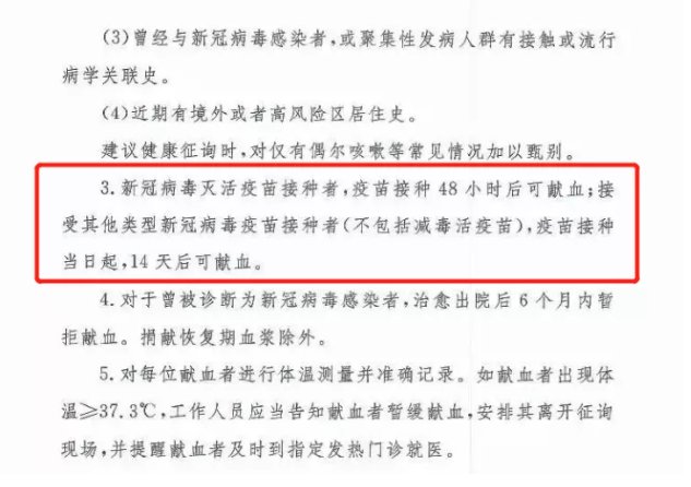2021年3月25日,国家有关部门权威发布:新冠病毒灭活疫苗接种者,疫苗接种48小时后可献血;接受其他类型新冠病毒疫苗接种者(不包括减毒活疫苗),疫苗接种当日起,14天后可献血。