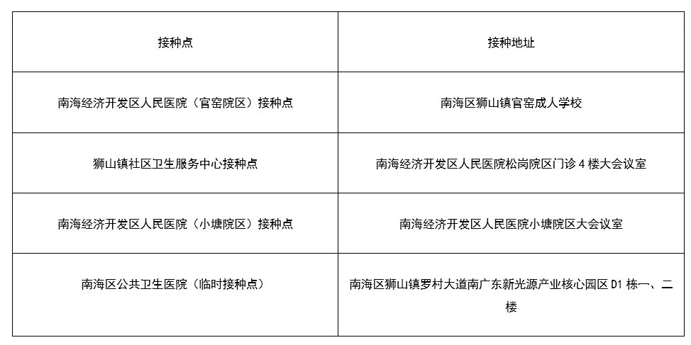 4、南海区公共卫生医院(临时接种点):南海区狮山镇罗村大道南广东新光源产业核心园区D1栋一、二楼。