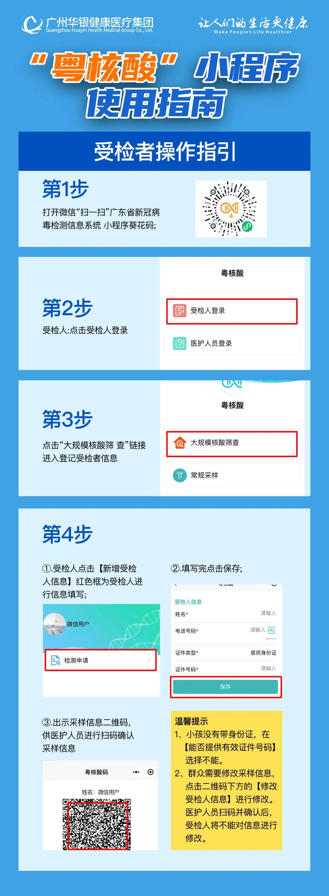 2、提前使用微信小程序“粤核酸4”填报信息流程(见下图),填写信息生成二维码后截图保存,到采样点后直接将二维码提供给登记人员读取信息,减少等候时间;也可帮家人(老人、小孩等成员)填写信息生成二维码后截图保存,数量不限。