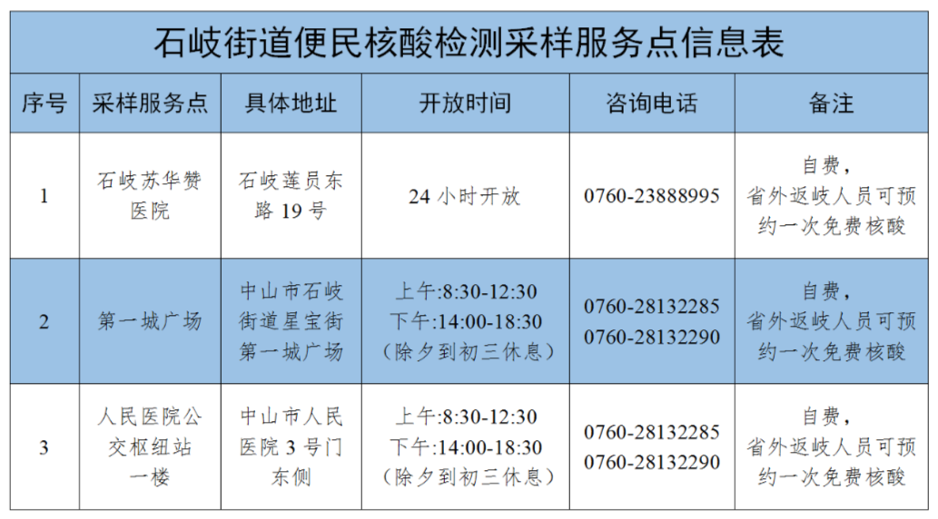 为进一步扩大核酸检测服务供给,方便群众就近获得核酸检测服务,石岐设置3处便民核酸采样服务点。所有省外返回石岐人员可通过“省外来返中山人员免费核酸检测预约小程序”,预约一次免费检测服务。