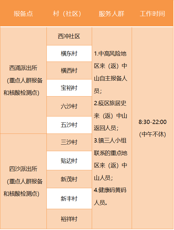 4月1日-15日期间,我镇涉疫地区重点人群报备和核酸检测点最新安排如下: