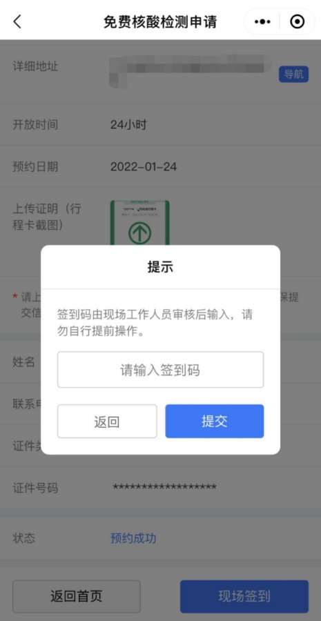 6、到达采样现场由现场工作人员审核身份证后,输入签到码完成签到。签到后视为已享受此次免费核酸检测服务。