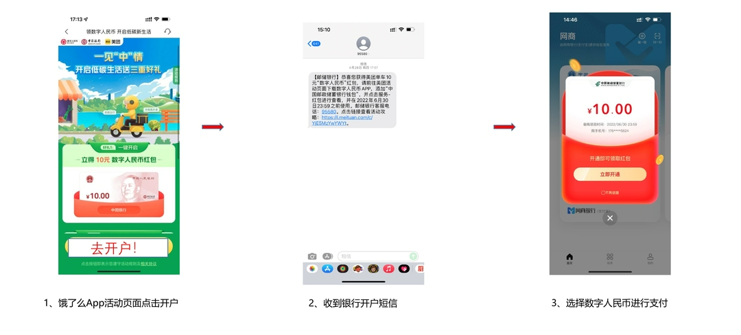饿了么App活动页面点击开户,收到银行开户短信,选择数字人民币进行支付