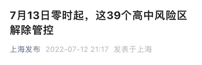 上海市新冠肺炎疫情防控工作领导小组办公室发布消息:根据国家第九版新冠肺炎疫情防控方案要求,经市新冠肺炎疫情防控工作领导小组办公室研究决定,自2022年7月13日零时起,将以下39个高中风险区解除管控: