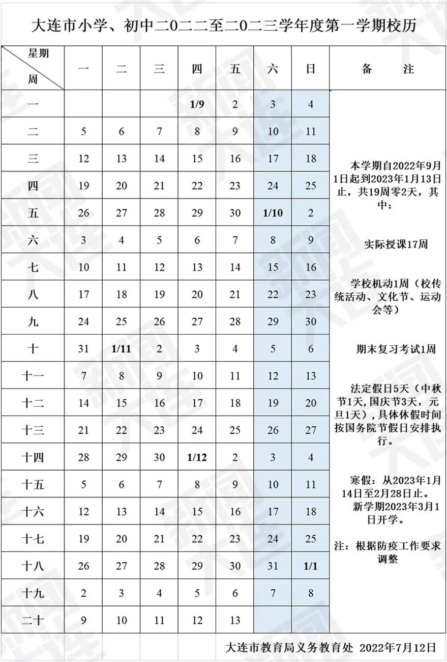 【大连市普通高中2022-2023学年度第一学期校历(寒假时间)】