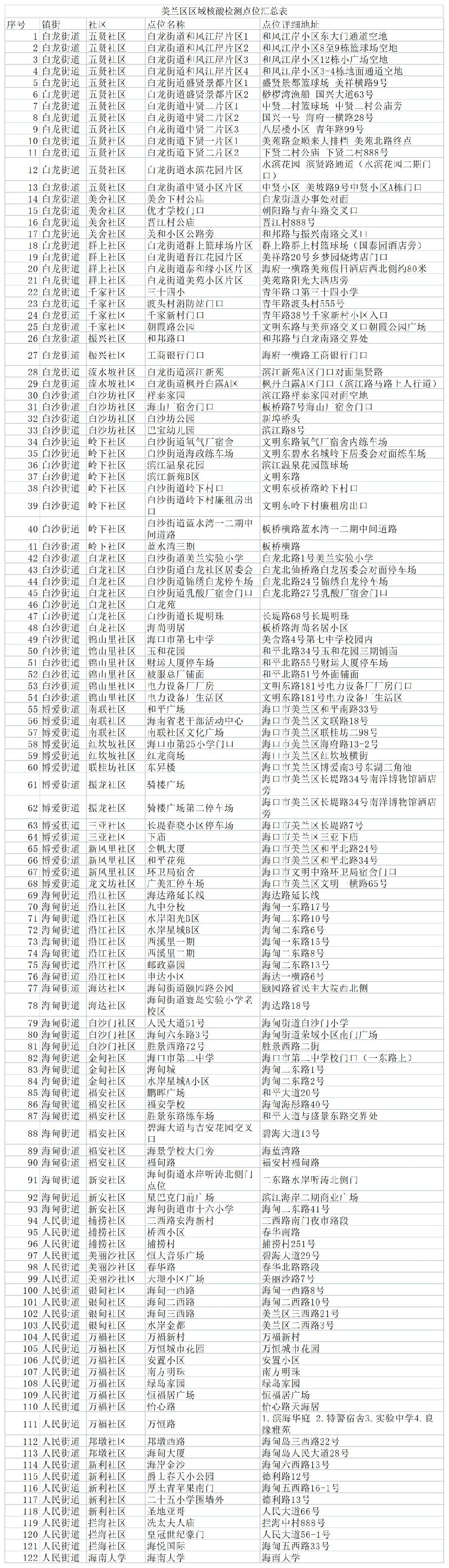 7月13日11时白龙街道、白沙街道、博爱街道开始检测,7月13日13时海甸街道、人民街道开始检测,具体点位详见附表。