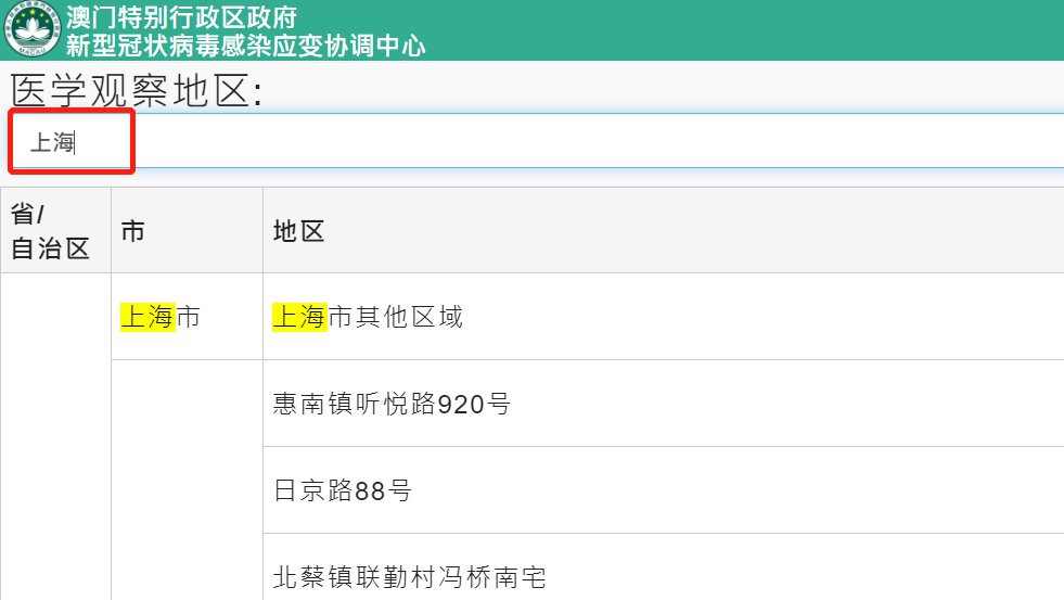 点击【所有地区】一栏,可选择相应省份查询该省份入境澳门防疫措施;